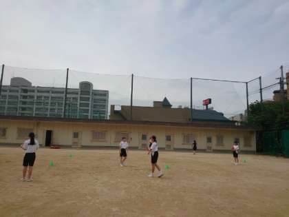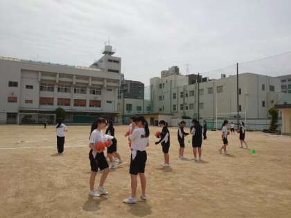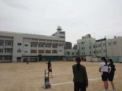 3年生女子体育で「ハンドボール投げ」の測定中。文部科学省の「新体力テスト」の種目になっているとのこと。指を大きく広げてボールをしっかりと掴み、投げる瞬間に体重を後ろから前へと移動させるイメージが大切。中3女子の平均は約14.7m。皆さん、平均を超えることができるでしょうか?