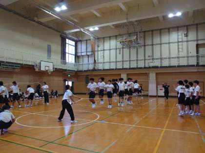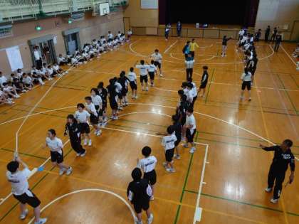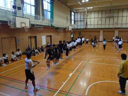 2種目目は「15人跳び」。各クラスから選ばれた15名の仲間が一斉に大なわを跳ぶ競技です。うまくタイミングを合わせないと、すぐに引っかかってしまいます。周りの仲間の応援が嬉しいですね。大会を通して、クラスの団結や絆が高まったように感じます。