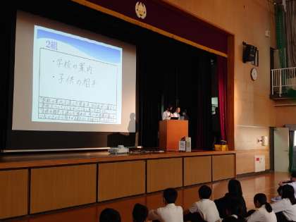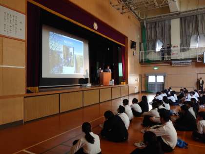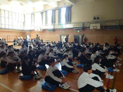 今日は生野区ジュニア防災リーダー(JDL)の2年生2名がお話をしてくれました。JDLは生野区内の災害リーダーとして活動するメンバーのこと。災害が発生したときにボランティアスタッフとして活躍します。同じ学年の仲間が頑張っているのは嬉しいですね。