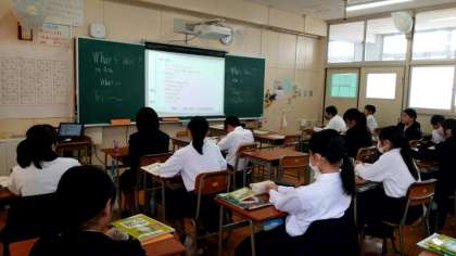 1年生英語の授業で、英単語の発音を練習中。スクリーンに次々に英単語が映し出され、ネイティブの音声にあわせて、みんなで声を合わせて発音します。これまでに習った英単語もだんだん数が増えてきましたね。お家に帰ったら、おさらいしましょう。