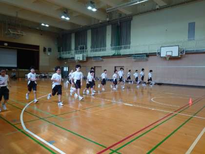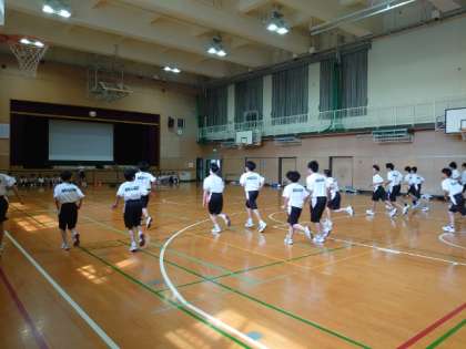 1年生男子体育で新体力テストの種目「シャトルラン」にチャレンジします。電子音に合わせて、20m間隔にセットされたカラーコーンを往復します。最初は電子音のリズムがゆっくりですが、次第にテンポアップし、走るスピードも上がっていきます。皆さんの持久力が試される種目。最初から飛ばし過ぎず、走るペースを考えてくださいね。