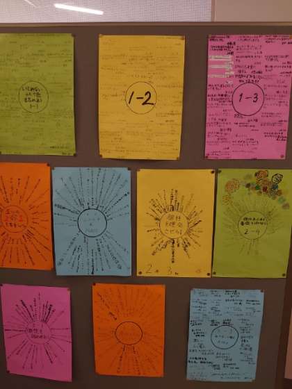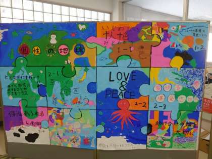 先日取り組まれた「いじめ(いのち)について考える日」で、生徒会から呼びかけがあった作品が完成しました。1つは各クラスで考えたいじめ防止のスローガンが描かれた絵をつなぎ合わせた世界地図「個性の地球」、もう1つはいじめの無いクラスについて皆さんの思いが綴られた寄せ書きです。1階の踊り場に展示していますので、皆さん鑑賞してください。