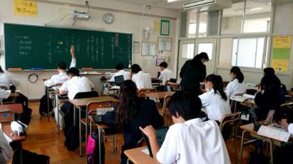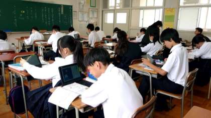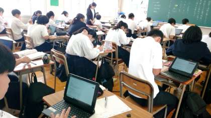 2年生国語の授業で「短歌の鑑賞文」を考えます。自分の好きな短歌を選び、その作品の良さや作者の思い、自身の感想を書き綴ります。皆さん、タブレット端末をインターネットに接続し情報を収集中。どんな鑑賞文が出来上がるでしょう?