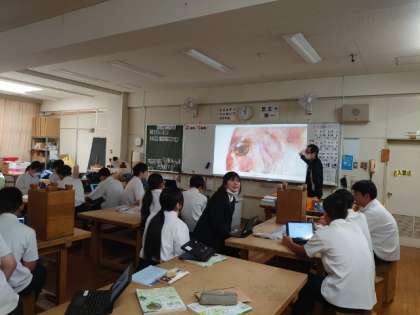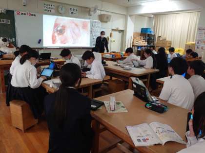 2年生技術の授業で学習している「コンピュータの仕組み」。今日は「解像度」について教わります。コンピュータやテレビのディスプレーに表示される画像の鮮明度のことで、解像度が高いときめ細かくきれいに、低いと粗(あら)く、ぼやけるそうです。技術室のスクリーンには鯛の画像が。拡大すればするほど画像がかすむのがわかりましたか?