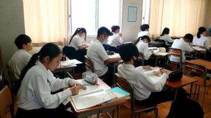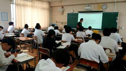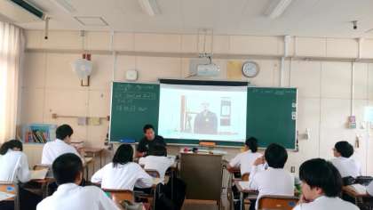 2年生英語科で「I think that 〜(私は〜だと思います)」の英文を学習します。今日は映像を視聴しながら英文(構文)の特徴や使い方をマスターします。スクリーンにはマシュー先生が登場し説明が始まりました。皆さん要点をメモしてくださいね。