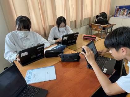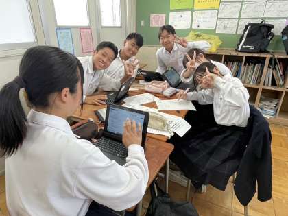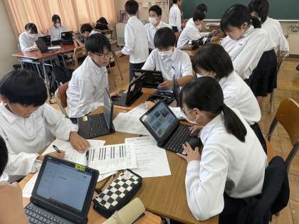 校外学習で訪れる施設を調べてパワーポイントにまとめています。班で役割分担をうまく進めているようです。