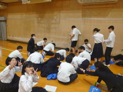 3年生の皆さんがグループ毎に何やら打合せ中。修学旅行の係のお仕事を確かめているとのこと。1日目に宿泊するホテルでの活動時、美化係や食事係・保健係などそれぞれ役割があるようです。みんなが快適に過ごせるように、よろしくお願いします!