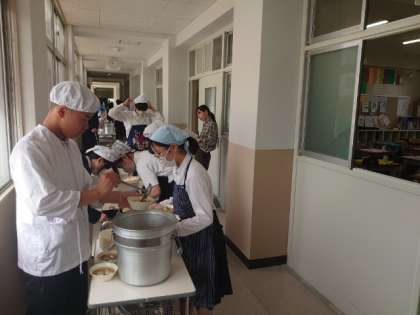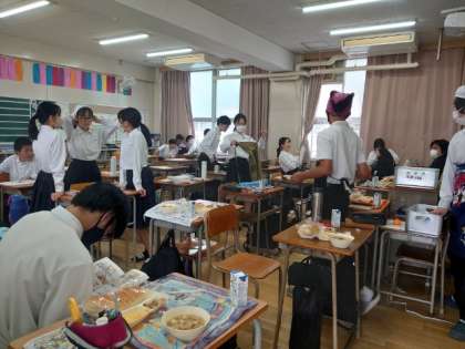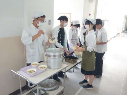 お昼休みのチャイムが鳴り、3年生の皆さんが協力して配食中。今日は「金時豆の中華おこわ・中華スープ・パインアップル」の中華献立。鶏肉をタケノコやニラ・モヤシと煮込んだ中華スープはお野菜をたくさんいただけそう。次回の給食は来週火曜日。月曜日はお昼ご飯を持ってきてくださいね。