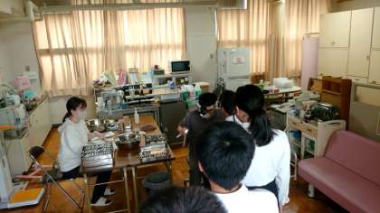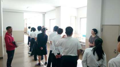 校医先生に耳・鼻・のどの状態を診ていただく耳鼻科検診。現在、2年生の皆さんが受診中。保健室前の廊下に出席番号順に整列し、静かに検診を待っています。検診後、皆さん「ありがとうございます」と言っていましたね。