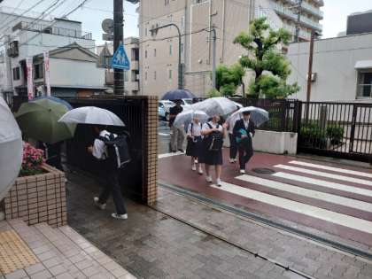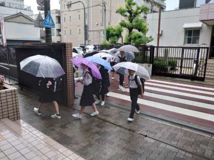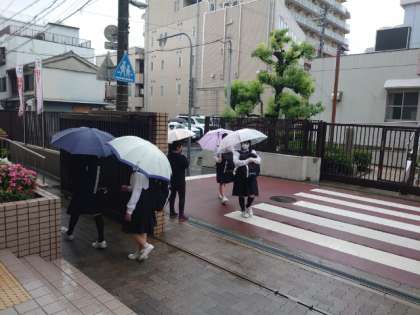 雨が降る中、皆さん元気に登校してきました。大阪市では「暴風警報」や「特別警報」が発表された場合に休校となります。予報では午後に雨脚が強まるとのこと。下校時に重ならないことを願います。皆さん、くれぐれも気をつけてくださいね。