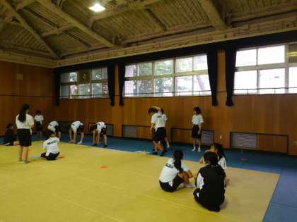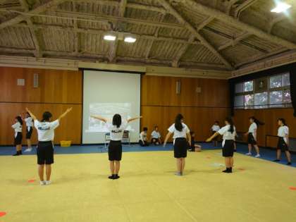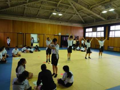 1年生女子体育の授業で「ラジオ体操」を練習しています。グループ毎に分かれて1つ1つの動きを確かめます。スクリーンにはカメラに写った自分たちの姿が。これなら改善点が一目瞭然。テストが2日後の木曜日にあるそうです。皆さん、頑張ってくださいね。