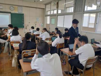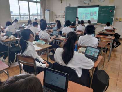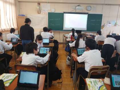 1年生の皆さんがタブレット端末を使って新聞記事を読んでいます。記事を読んで内容を簡単にまとめる練習を行うとのこと。記事のポイントを要約し、わかりやすく表現する力を養っていきましょう。