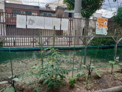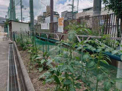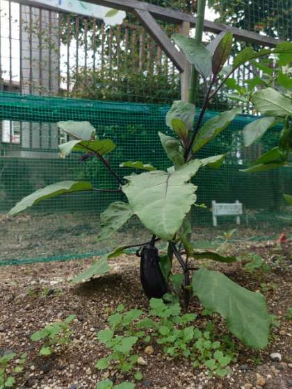 なかよし学級の皆さんが栽培している農園でナスやミニトマトが実っています。太陽の光をたくさん浴びてスクスクと成長しています。まだまだ小さいですが、可愛い実ができています。収穫室したお野菜をどう調理しましょう?