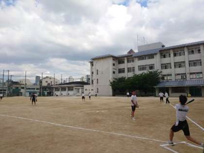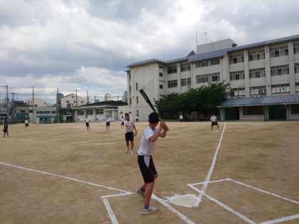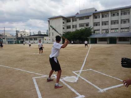 3年生男子体育の授業でソフトボールを楽しんでいます。ふだんより近くから優しくゆっくりとボールを投げている模様。タイミングが取りやすいのか、皆さんフルスイングでボールを飛ばします。ナイスバッティングが連発しそうです。