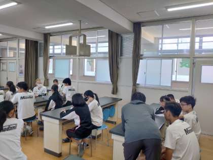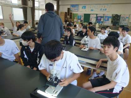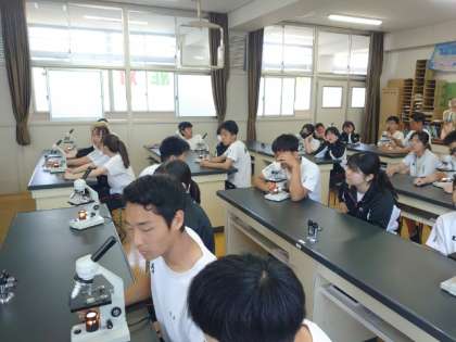 3年生理科の授業で「細胞分裂」のようすを観察します。タマネギの根の先を塩酸処理し、染色した後、顕微鏡で観察します。皆さん、集中して顕微鏡を操作しています。赤紫色に染まった細胞の核や染色体の様子が確かめられましたか?