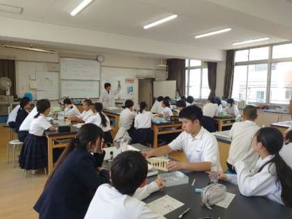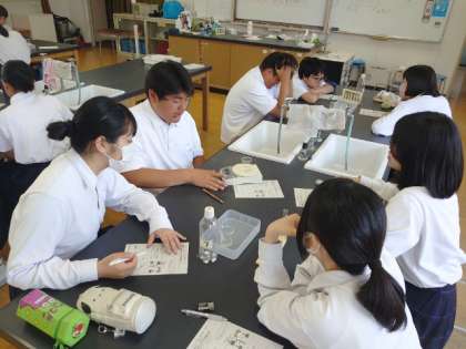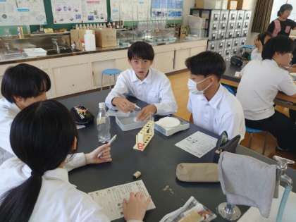 2年生の皆さんも理科室で何やら実験に取り組んでいます。さまざまな物質の化学変化による質量の変化を調べるそうです。透明な2つの液体(塩化バリウム・硫酸)を混ぜると、一瞬で真っ白な硫酸バリウムに変化しました。質量の変化はどうなったでしょう?みんなで調べてくださいね。