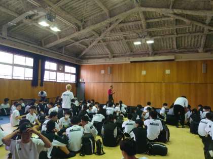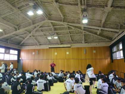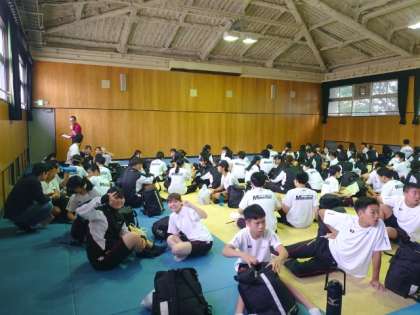 皆さん、武道場に集まってきました。まもなく出発式が始まります。