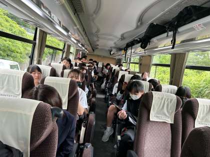 次々に流れる音楽の曲名をみんな的確に当てています。バスレク担当は選曲を流すのに大急ぎです。桃谷中学校を出発してから順調に、車内は優しい雰囲気に包まれて吉野川ハイウェイオアシスに向かっております。
