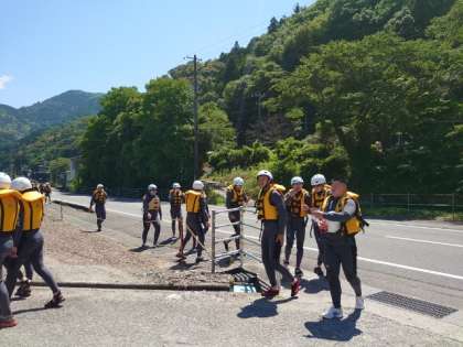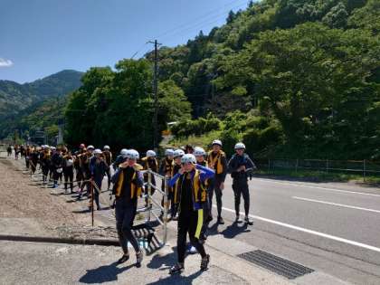 ラフティングの出発ポイントに着きました。河原まで歩きます。