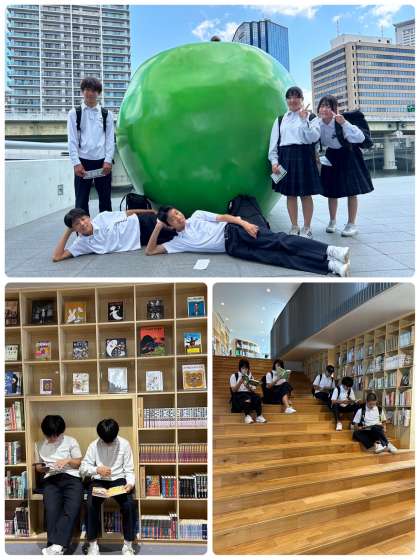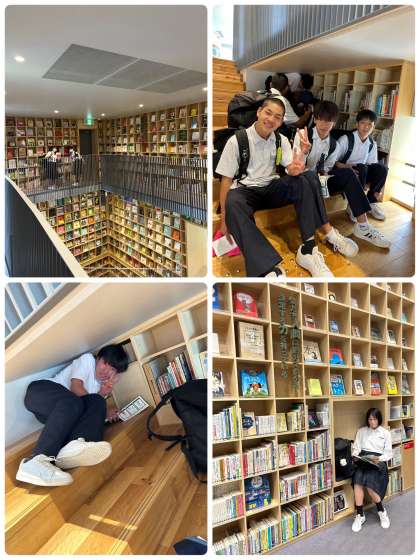 中之島のこども本の森です。みんな、いろいろな場所で読書中です。