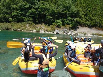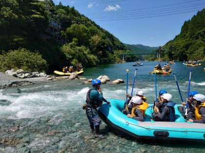 インストラクターの方からオールの使い方を教わります。しばらくは流れのゆるやかな場所で漕ぎ方を学びます。