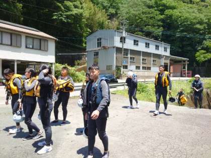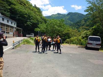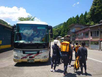 ラフティングを終えた皆さんがバスに戻ってきました。皆さん、冒険はいかがでしたか?