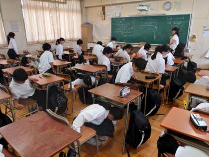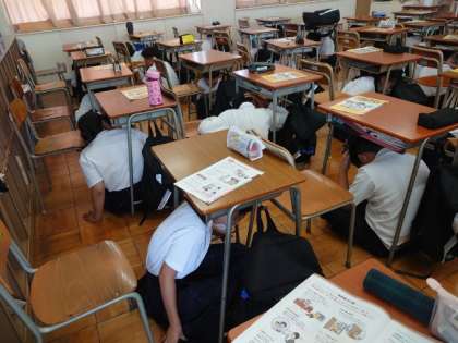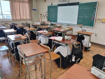 本日6時間目、地震を想定した避難訓練を行いました。地震発生の緊急放送を合図に、1年生の皆さんが机の下に入って身の安全を守ります。