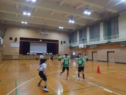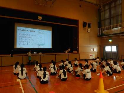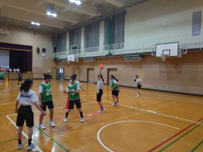 2年生女子体育の授業で「ニュースポーツ」に取り組みます。各陣地にセットされたカラーコーンをグループで奪いあう競技です。相手にタッチされるとアウトになるのは、鬼ごっこと一緒ですね。