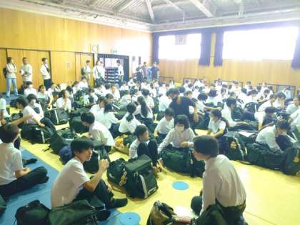 1年生の皆さんが、集合場所の武道場に集まってきました。予定時刻よりも早めに集合完了できそう。1人1人の時間に対する意識がしっかりしていて感心します。