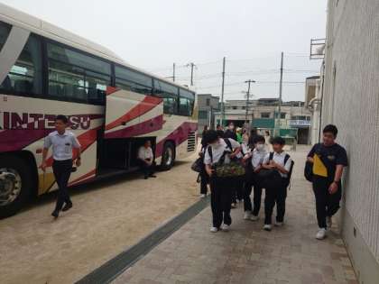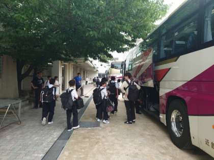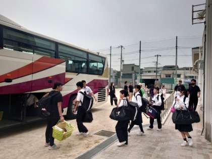 荷物をトランクに入れて、座席へと向かいます。送っていただくバスの運転手さんに、ごあいさつしましょうね。