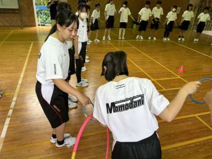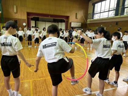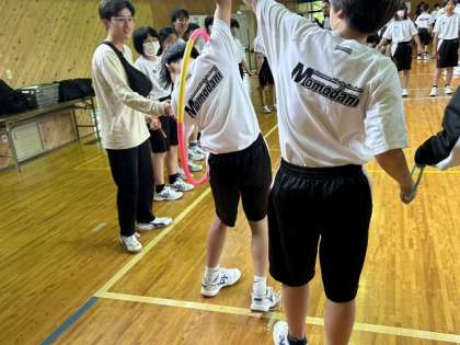 1本のフラフープを順番にくぐっていく競技です。仲間の温かい応援が嬉しいですね。