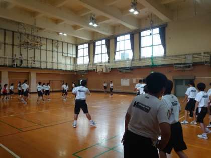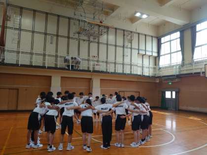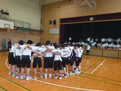 いよいよ試合が始まります。クラス全員で円陣を組んで、気合いを注入しています。皆さんの「オオッ」というかけ声が体育館に響いています。