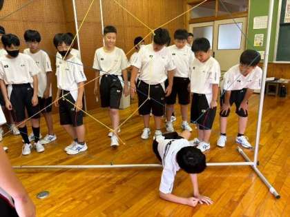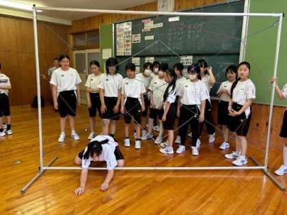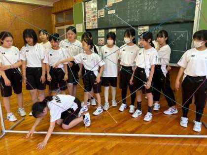 「スパイダーネット」と呼ばれる網を使ったアクティビティ。ネットに引っ掛からないように、上手くすり抜けられるでしょうか?