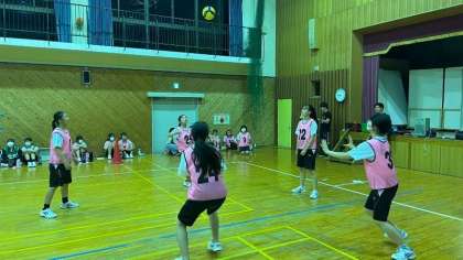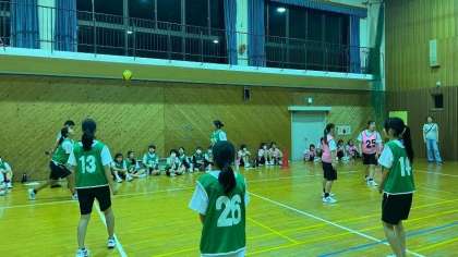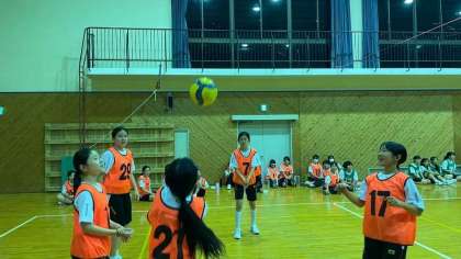 女子の皆さんはバレーボールに挑戦します。みんなで輪になってパスをつなげます。何回続けられたでしょう?