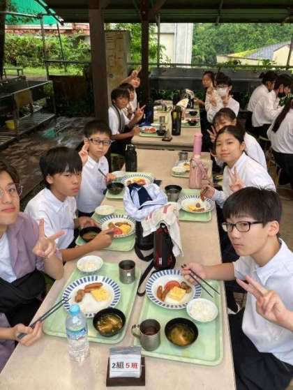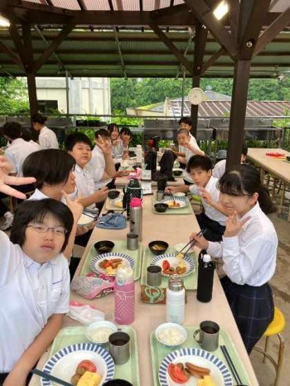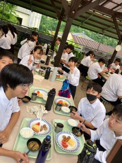 朝のつどいの後、みんなで朝ごはんをいただきます。雨が降っていますが、中庭の食事スペースは屋根があるので大丈夫です。