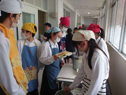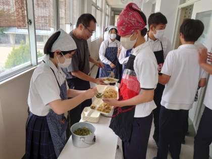 学校ではお昼休みに入り、3年生の皆さんが給食の準備中。今日のメニューは「和風焼きそば・オクラの甘酢和え」。お醤油の香り漂う焼きそばは、とても美味しそう。3年生は給食後、高校見学に出発します。皆さん、気をつけて行きましょう。