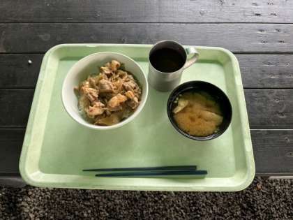 お昼ごはんをいただきます。本日のメニューは丼ぶりとお味噌汁です。