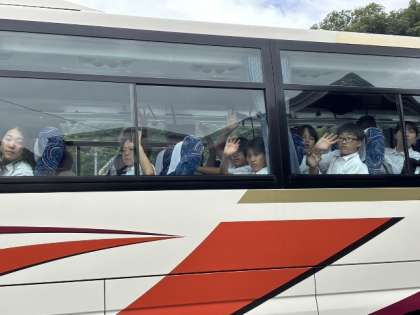 いよいよバスに乗車し、学校をめざします。予定より約30分遅れての出発。今のところ、学校到着は午後4時前になりそうです。