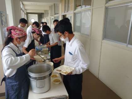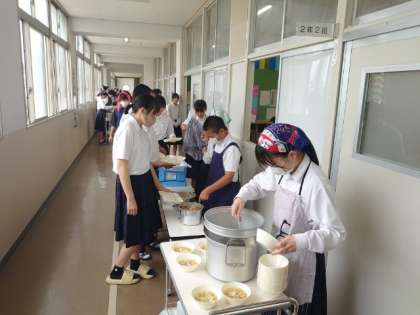 お昼休みのチャイムが鳴り、2年生の皆さんが給食の準備を行っています。今日は「豚のゴマ味噌焼・切り干し大根の炒め煮・すまし汁」の和風メニュー。水曜日から期末テストがスタートするので、今週給食をいただくのは今日・明日になります。