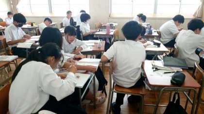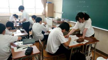 1年生数学の授業で期末テスト対策に取り組みます。テスト範囲の「正負の数・文字式」について、互いに教え合いながら問題を解いています。教え合うことで学習内容が定着する効果がありますよ。数学のテストは明後日の木曜日。皆さん、頑張ってくださいね。