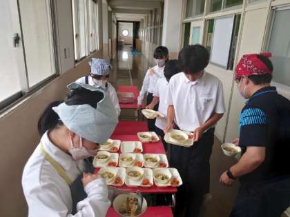 4時間目の授業が終わり、1年生の教室前で給食の配膳が始まりました。今日は「エビのチリソース・中華スープ・ヨーグルト」の中華メニュー。明日水曜日から週末の金曜日まではテストのため、給食はお休みに。次回は来週月曜日(7月1日)になります。