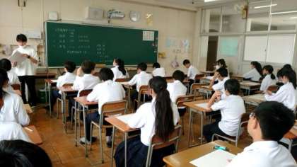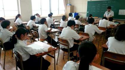 1年生の教室では、1時間目「国語」のテストが配られています。チャイムが鳴るまでの間、静かに気持ちを落ち着かせます。集中力を高めて、50分間を有効に使いましょう。