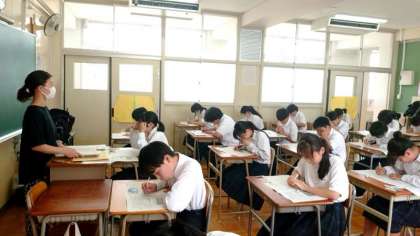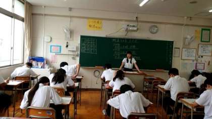 2年生の皆さんも社会科のテストを受けています。2年生では「日本の気候」に関する問題が出ていますね。季節風の影響を受ける日本は、太平洋側と日本海側で気候の特徴が異なります。皆さん、正解できそうですか?