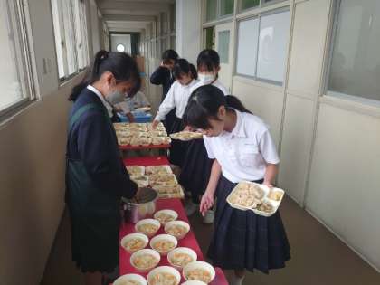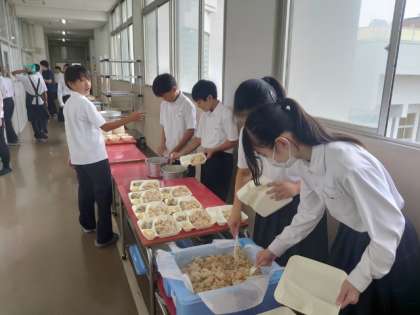 お昼休みになり、1年生の教室前で給食の準備が始まりました。今日の献立は「ゴーヤチャンプルー・焼きじゃが芋・五目汁・かやくご飯」。ゴーヤは抗酸化作用のあるビタミンCが多く含まれるそうです。しっかりいただいて免疫力をアップさせましょう。