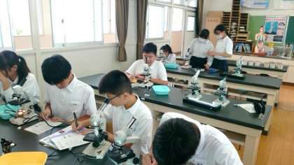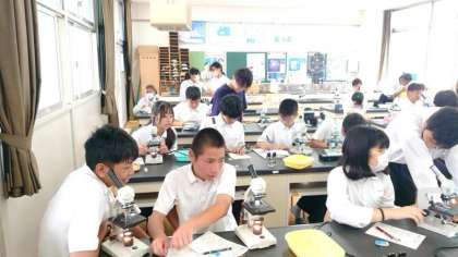2年生の皆さんが理科室で顕微鏡を操作しています。「カナダモ」の細胞を観察するとのこと。たくさんの細胞が集まっている様子や緑色の葉緑体が確認できました。ワークシートにスケッチして特徴をまとめましょう。