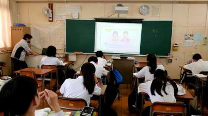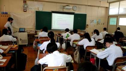 1年生英語の授業で英会話の内容を聞き取る学習が行われています。スピーカーから会話文が流された後、皆さん質問に答えていきます。スクリーンに映された会話文を見ながら、正解を考えましょう。