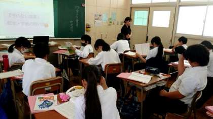 1年生国語の授業で、向田邦子さんの「字のない葉書」を鑑賞します。作品で描かれている、それぞれの場面を結びつけながら、ワークシートに内容をまとめます。先生からのヒントを参考に、上手くまとめてくださいね。
