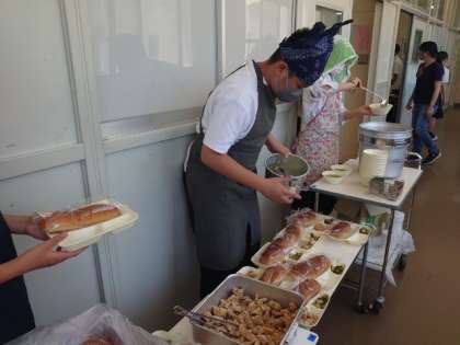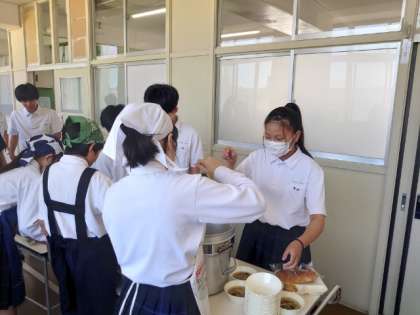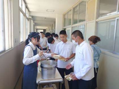 お昼休みになり、2年生の教室前で給食の用意が行われています。今日のメニューは「鶏の唐揚げ・ハムと春雨の中華スープ・キュウリの中華和え」。サクッと揚がった唐揚げは人気がありますね。今日は早々に売り切れそうです。