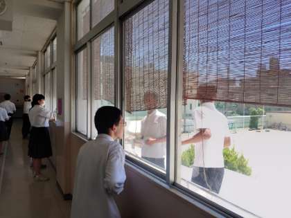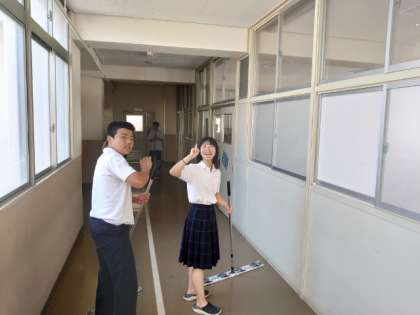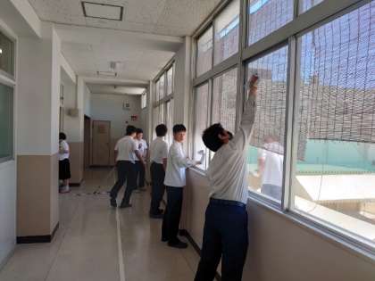 3年生の皆さんは、校舎2階を中心にすみずみまでお掃除中。互いに協力して取り組むと、早くキレイになりますね。1学期間過ごした学び舎に感謝して、美しくしてくださいね。
