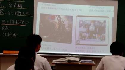 3年生社会科の授業で、世界の名画を学習中。ルネサンスやフランス革命期のロマン派など、歴史的に著名な作品が紹介されています。美術の授業(美術史)で教わった作品もあるのでは?それぞれ関連付けて、覚えてくださいね。